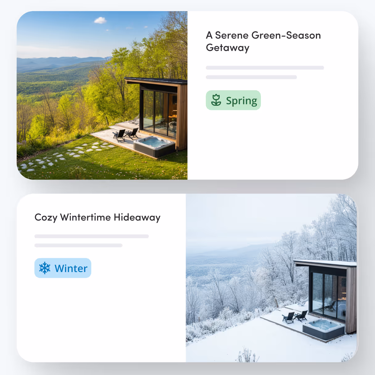 Professional photos still lose relevance when shown out of season. Seasonal Listings adapt existing visuals to match guest travel dates. No reshoots are needed to restore relevance and conversion impact.